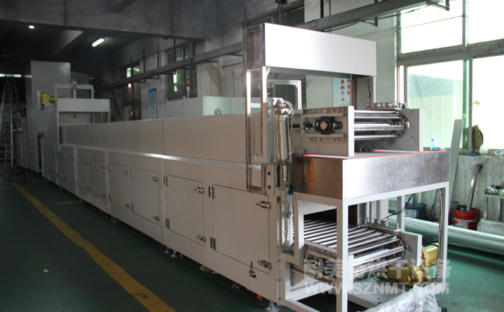 生產(chǎn)流程:1.治具到達上件工位→→→2.機械手取件放置→→→3.進烤爐升溫階段(速度溫度均可調(diào))→→→4.退火階段(速度溫度均可調(diào))→→→5.下風(fēng)冷卻(2-5分鐘可調(diào))→→→6.治具到達下件工位→→→7.治具空走返回上件工位;